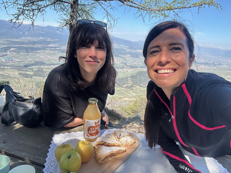 Tante le attività che si possono fare qui, sia in agritur che nei dintorni. Io e Martina siamo salite con Alessandra alla Crucola, questo belvedere naturale di roccia che offre una vista incredibile su tutta la valle. Si tratta di una camminata di un paio d’ore nel bosco con circa 400 metri di dislivello. Un po’ di fatica che verrà ripagata non solo dal panorama, ma anche dalla merenda che vi verrà proposta. Succo di mela, qualche dolce tipico come – per noi – le mele in camicia ed una deliziosa torta, un po’ di the caldo e ovviamente le mele!