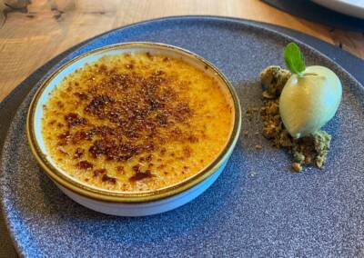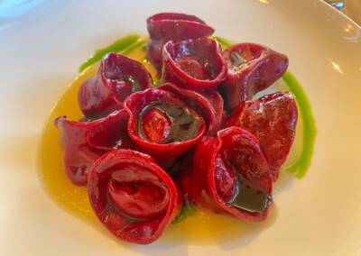 • Franzin Alm. Prenotate uno dei tavoli nella saletta interna e concedetevi un’esperienza culinaria senza paragoni. Thobias vi incanterà con i suoi piatti (qui sotto ravioli alla rapa rossa ripieni di formaggio di malga) e dolci da leccarsi i baffi. Come questa crème brûlée.