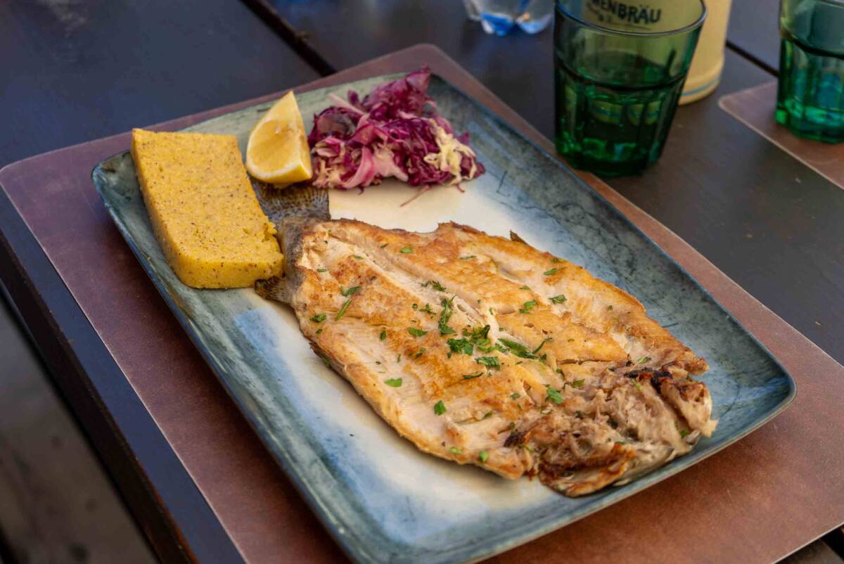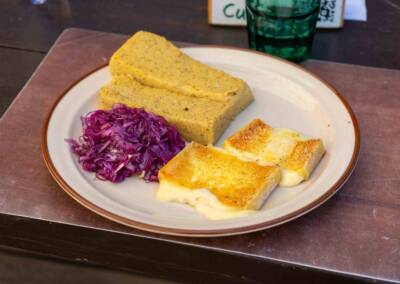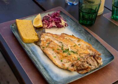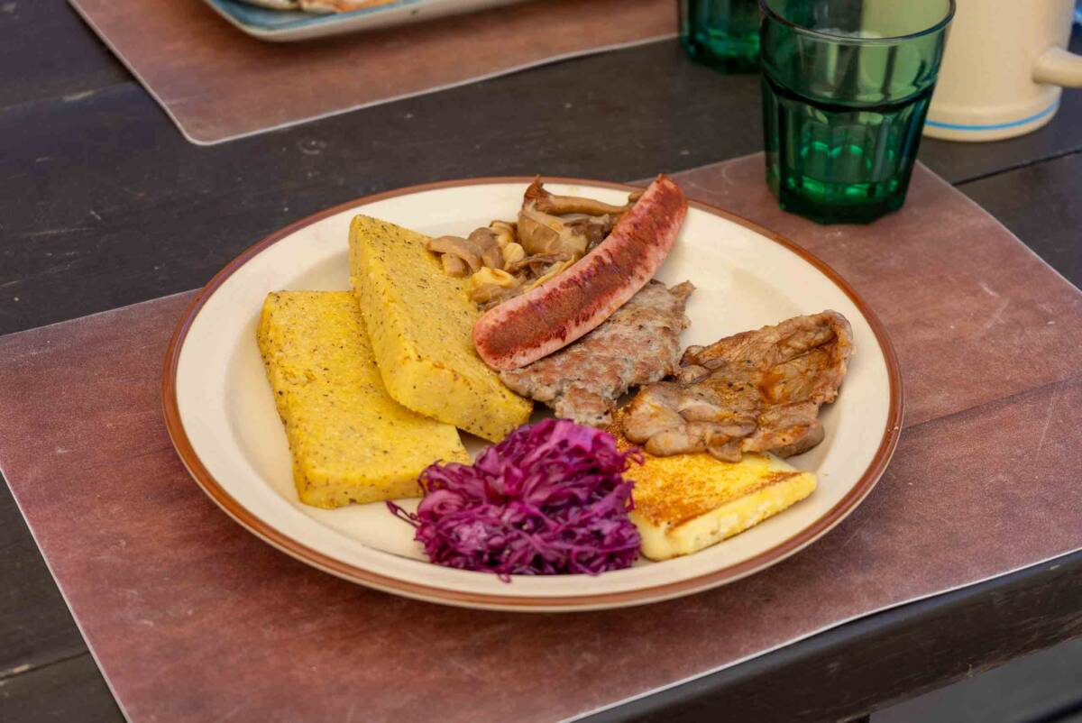 A pranzo i piatti della tradizione trentina: polenta, formaggio fuso e salsiccia, ma anche la trota al forno.