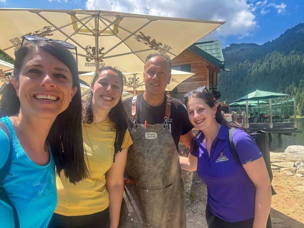 E il giorno dopo? Noi eravamo reduci dalla conquista della cima del Carè Alto e quindi ne abbiamo approfittato per una giornata di relax. Facendo il giro del lago. sulla sponda opposta, ci siamo fermati sul prato a bordo acqua a prendere il sole e a fare qualche bel bagno gelato.