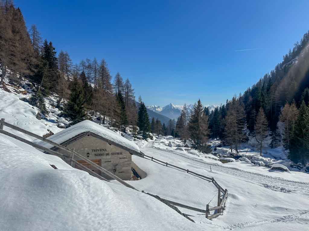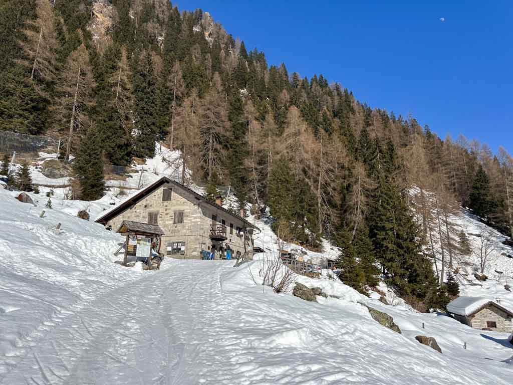 Uno dei pochi rifugi (non sulle piste da sci) ad essere aperto in inverno tutti i giorni, il Trivena è davvero un posto incantato. Paradiso per gli amanti dello scialpinismo, con tanti tracciati per raggiungere cime alte anche oltre tremila metri, è allo stesso tempo un posto facile in cui si può arrivare a piedi. A 1.650 metri, si arriva in poco più di un’ora e 450 metri di dislivello.