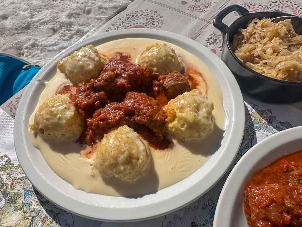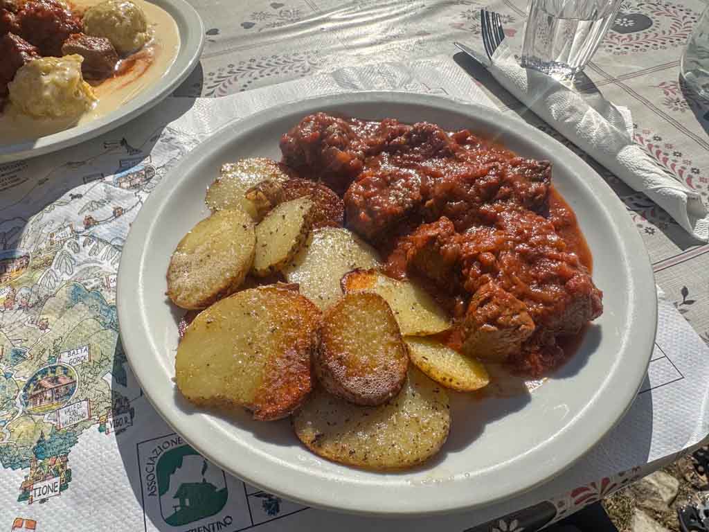 Ottimi i piatti della tradizione trentina, con un menù vario ed articolato. Alquanto inusuale in montagna, ma come vi dicevo qui la passione non manca, anche in cucina. Per noi ‘gocce’ di polenta con formaggio fuso e spezzatino. Ottimi.