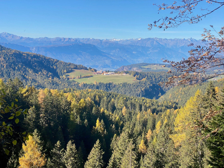 Le malghe si trovano a poca distanza una dall’altra e quindi sono facilmente raggiungibili per la maggior parte anche in una sola giornata. Quando ho voglia di camminare solitamente dal Santuario di Pietralba prendo il sentiero nel bosco e salgo verso la Schmiederalm per poi andare verso la Belriposo. Da lì proseguo per la Neuhütte e poi scendo verso Malga Laab, Monte San Pietro e di ritorno al Santuario. Che può essere ammirato anche dall’alto con questo scorcio panoramico. Mi fermo a mangiare quando ho fame, tanto devo dire che da tutte le parti si mangia sempre bene. Calcolate un giro di 4/5 ore senza grandi dislivelli, tipo 300 metri circa. È tutto ben segnalato.