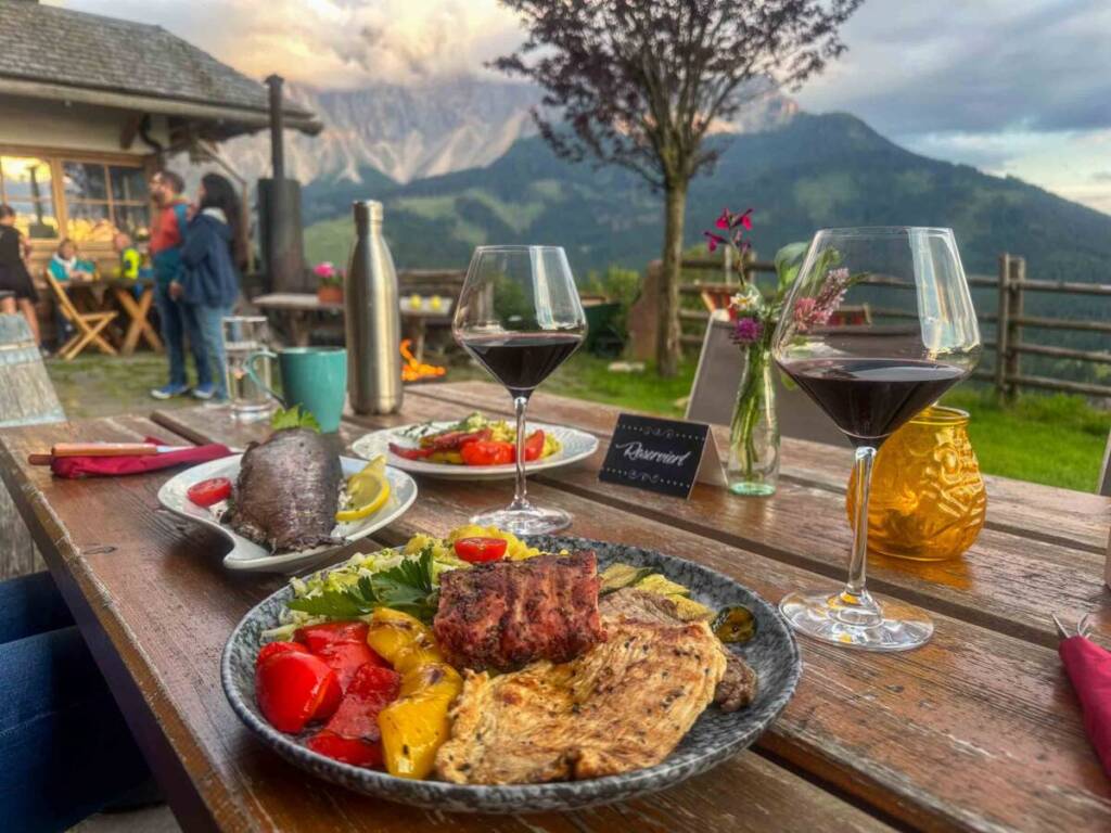 Sono molti gli ingredienti che troverete nei piatti che vengono prodotti al maso, come le uova, la verdura, la carne di manzo e maiale. Menù ampio e variegato, con i piatti tipici: canederli con goulash; uova, speck e patate saltate, taglieri di formaggi e affettati, zuppe di diverso genere, ravioli ripieni, cotoletta con patate saltate, hamburger di vari tipi e così via. Per noi trota affumicata e grigliata mista con verdure (cavolo cappuccio, mais, zucchine e peperoni) e insalata di patate. E come accompagnamento un buon calice di Lagrein.