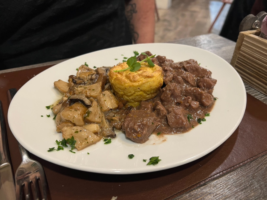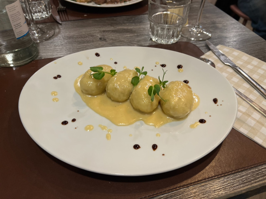 Abbiamo continuato con un primo goloso: gli gnocchi ripieni di mele e speck sul fonduta di formaggio, che sono stati un trionfo per i nostri palati golosi e infine abbiamo assaggiato una vera specialità local: il gulasch di camoscio con tortino di polenta e funghi (porcini super, raccolti da Tullio).