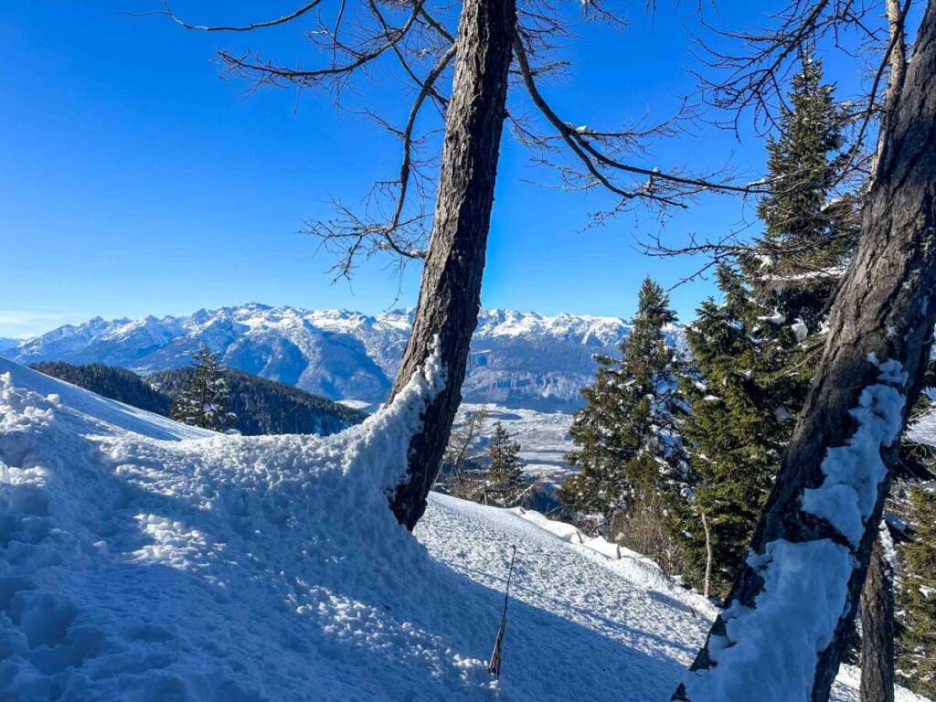In un’ora circa, solo andata, potete raggiungere il Corno di Tres, grandioso punto panoramico a quota 1810 metri. Escursione semplice, con circa 250 metri di dislivello e 2,3 chilometri di distanza, su strada forestale e sentiero finale nel bosco. Normalmente è battuto, se ha nevicato molto o da poco ricordate di portare con voi le ciaspole. A me piace sempre andarci prima di pranzo, di modo tale da godermi poi la meritata pausa, però non è male nemmeno andarci dopo.