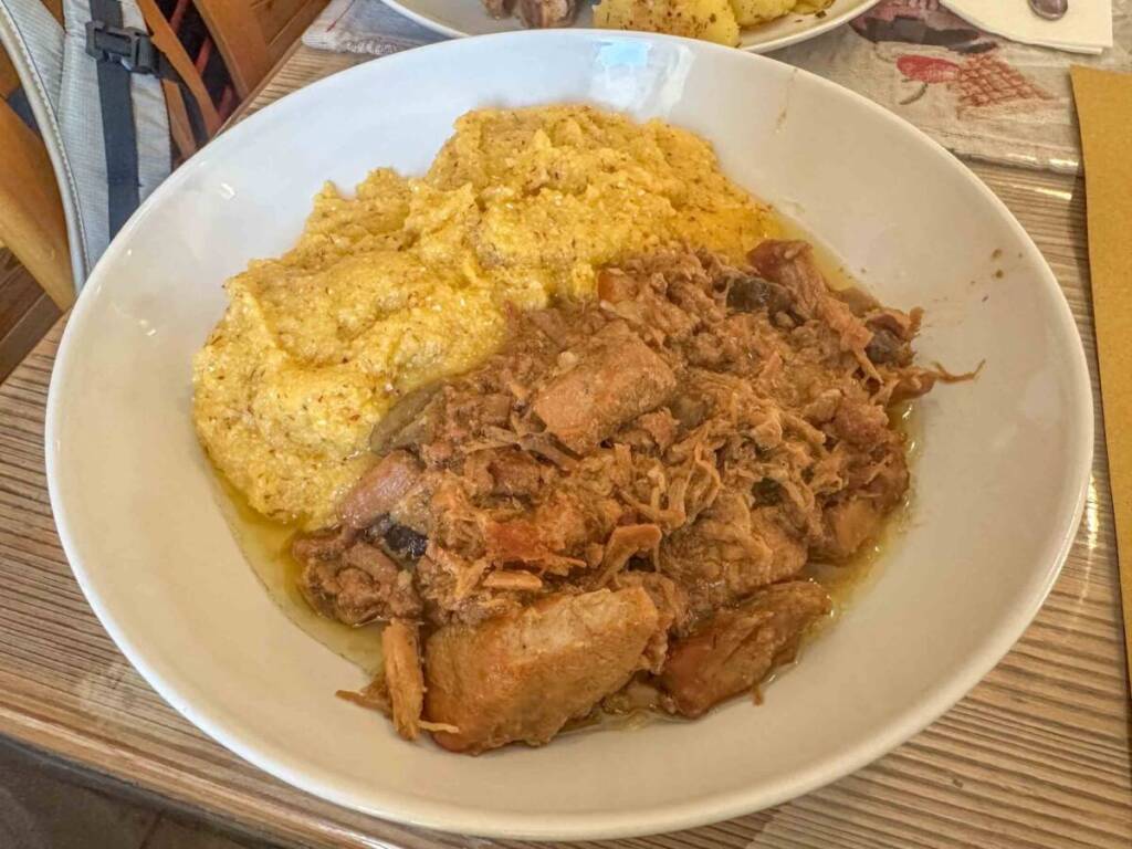 Gestione tutta al femminile, con Anisoara (con me nella foto) e sua suocera che accolgono i visitatori con un bel sorriso. Nel menu sempre alcuni primi piatti, alcuni secondi e dei dolci. Per noi polenta con spezzatino e funghi…