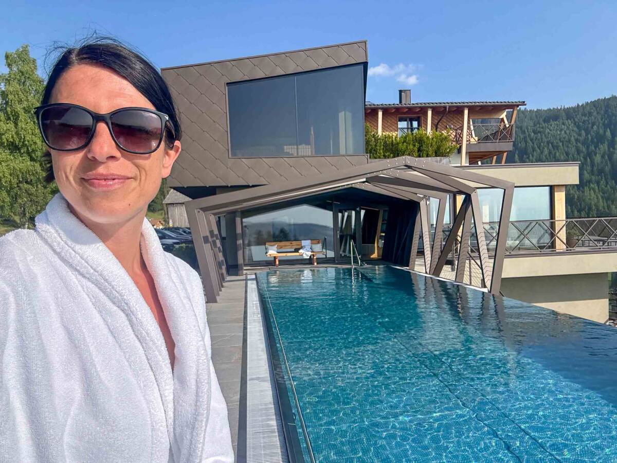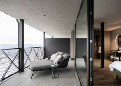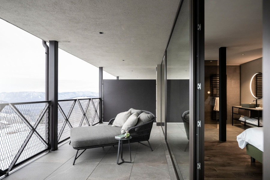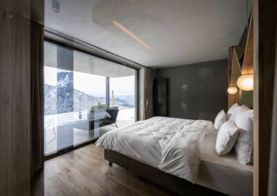 Il cubo che si vede nella parte sopra ospita la sauna, panoramica anche quella. Ampia, con il caratteristico odore di cirmolo, è davvero un’oasi di pace. Si accede qui salendo dalla scala interna, abbandonandosi al calore e alla grande bellezza del panorama oltre le grandi vetrate.