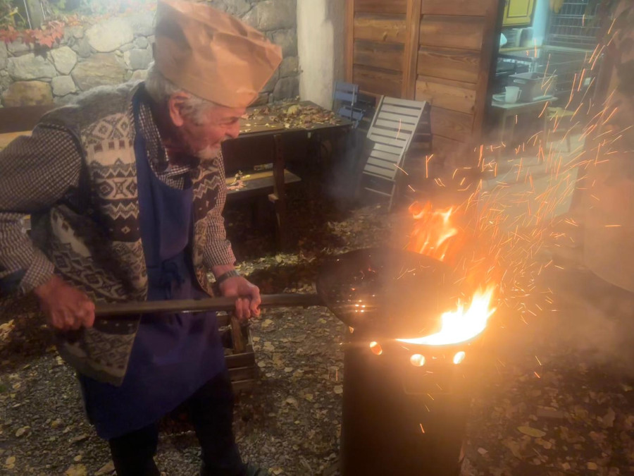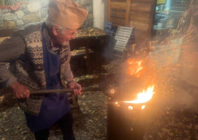 E poi le immancabili castagne, cotte sulla brace dal papà di Christian, Hainz. Un personaggio che da solo vale la visita al maso, tra barzellette e racconti della sua vita avventurosa da artista. Eccolo qui all’opera, ma è impossibile spiegarvi il clima che c’è qui fino a che non lo provate di persona. Lo stesso vale per Christian, oste eccentrico e brillante che troverà sempre il tempo per sedersi con voi e fare quattro chiacchiere, preferibilmente con giochi di parole e barzellette.