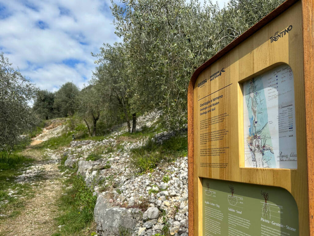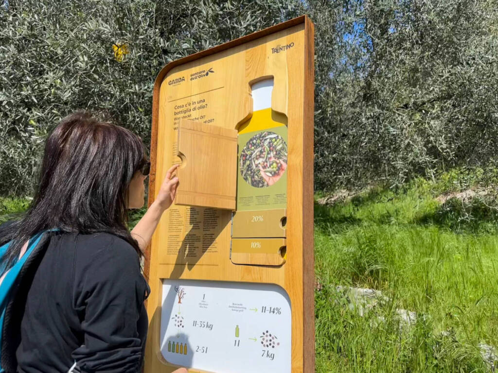 Da lì le indicazioni sono chiare e comincerete ad attraversare l’olivaia di Arco, che conta oltre 40.000 olivi. Bellissima la vista sulla piana, che abbraccia i paesi di Torbole e Riva, il Monte Brione ed il Lago di Garda. Lungo il sentiero si incontrano ben quattordici installazioni, alcune interattive, che permetteranno di conoscere diversi aspetti dell’olivicoltura: dal clima al terreno in cui cresce la pianta, dalla raccolta delle olive al processo produttivo in frantoio.