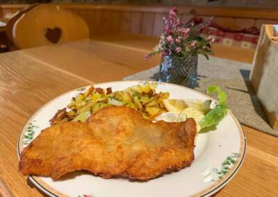 In autunno vi prepareranno costolette con patate arrosto, salsicce con crauti, Krapfen alle castagne, grigliata mista con crauti, canederli e patate arrosto, ravioli ripieni di zucca e zuppa d’orzo. Dal 14 settembre al 15 dicembre 2025 aperto il lunedì alle 17, martedì e mercoledì giorno di chiusura, e poi da giovedì a domenica (giovedì e venerdì anche a cena dalle ore 18, sabato e domenica solo a pranzo). Costo menu törgellen: 35 euro a persona escluse bevande, possibilità di scegliere dal menù alla carte con variazione di prezzo.