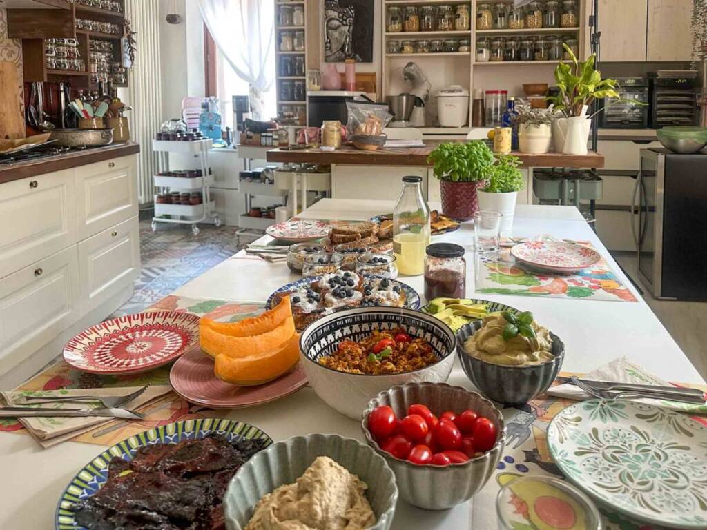 Questa infatti è la tavolata con alcuni dei piatti che abbiamo preparato assieme, ammirando le capacità e la creatività di Katia ai fornelli. Hummus, crema di anacardi, farinata di ceci, tofu cucinato in diversi modi, tempeh: un mix di cucina etnica ed ingredienti caratteristici della cucina vegetale. Perfetta per me che sono curiosa, ed intollerante ai latticini. Luca, invece, è un grande “piccolo chimico” che dà vita a kombucha (bevanda leggermente acida e frizzante, ottenuta dalla fermentazione del tè zuccherato), kimch (piatto tradizionale coreano, fatto di verdure fermentate con spezie), miso (pasta fermentata a base di legumi), tempeh (alimento fermentato ricavato dai semi di soia gialli, tipico del sud est asiatico) e ginger e turmeric beer. Assolutamente da provare!
