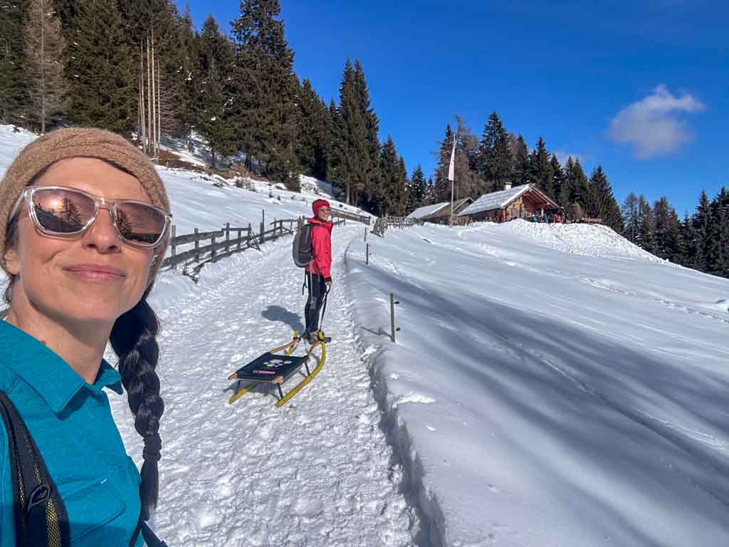 Ci sono almeno tre accessi diversi. Noi siamo salite da Senale San Felice. Da Fondo, in val di Non, abbiamo preso la strada per Passo Palade. Poco prima abbiamo svoltato a sinistra seguendo le indicazioni per il paesino. Tenendolo sulla sinistra, abbiamo proseguito per circa 500 metri fino al parcheggio ben segnalato della Weissenalm. Se è pieno ce n’è anche un altro imboccando la forestale che sale verso la malga, qualche decina di metri più su. Altrimenti, come abbiamo fatto noi, parcheggiate in paese e poi tornate verso il parcheggio. Da lì sale appunto la strada forestale coperta di neve, che al ritorno può diventare anche una divertente pista da slittino. Dovete però portarla con voi, perchè non la affittano. Attenzione però che la strada ha una bella pendenza in alcuni tratti, quindi fate attenzione. Sempre consigliato, per salire, avere con sé i ramponcini da mettere sotto gli scarponi perchè il fondo ghiacciato potrebbe essere scivoloso.
